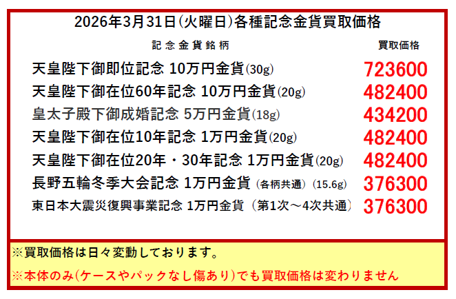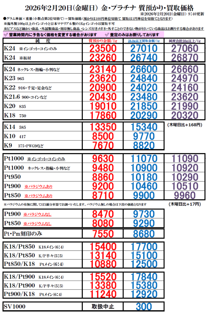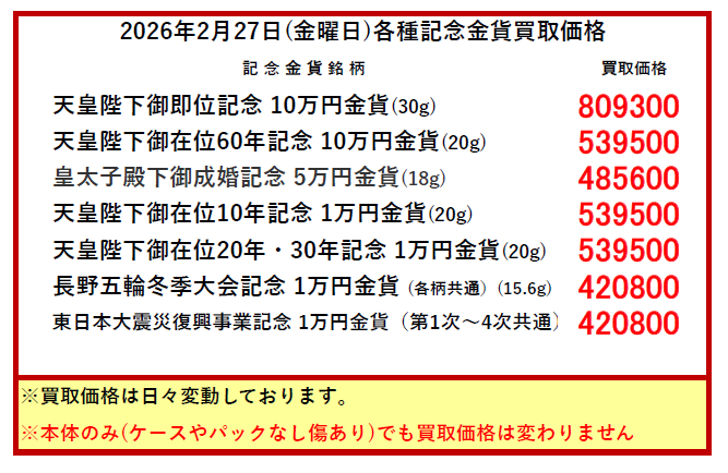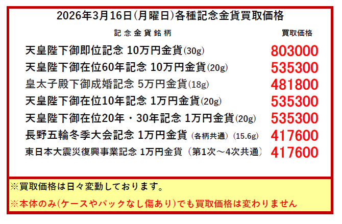 ※買取価格は毎日変動します。上記価格は当日のみ有効です。当日の買い取りは午前10時頃に更新します。
