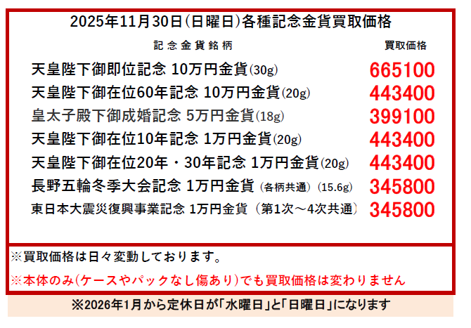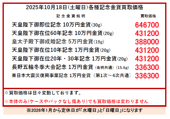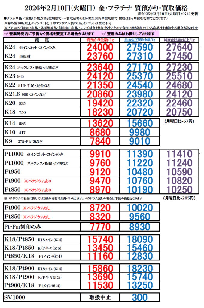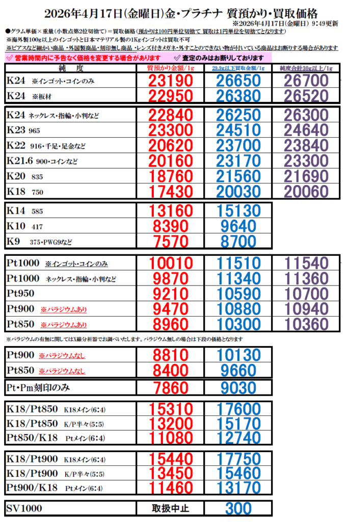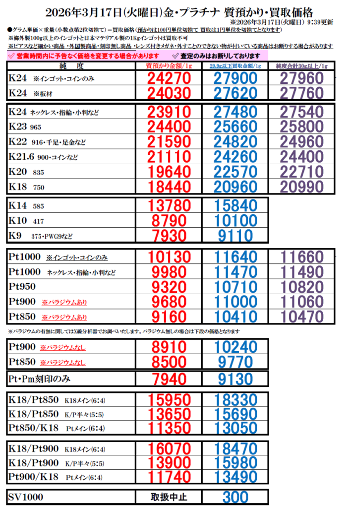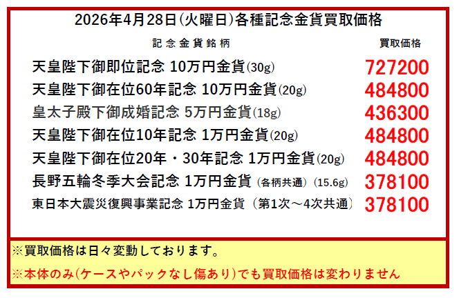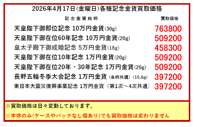 ※買取価格は毎日変動します。上記価格は当日のみ有効です。当日の買い取りは午前10時頃に更新します。