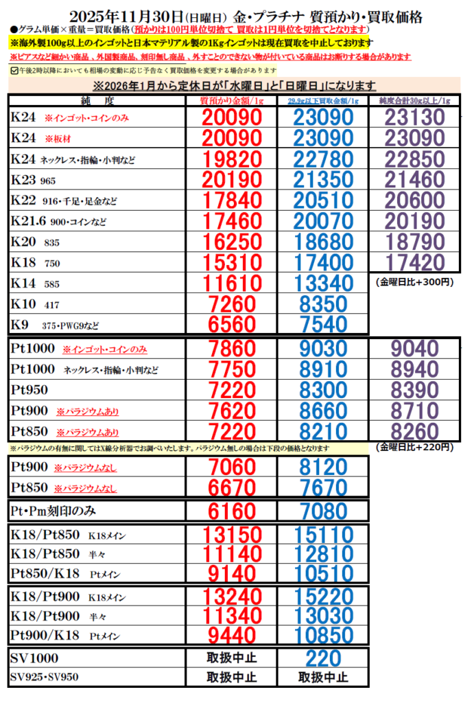 | Pt900 ( Pm900 ) | 8660円/1g | 8710円/30g以上 |