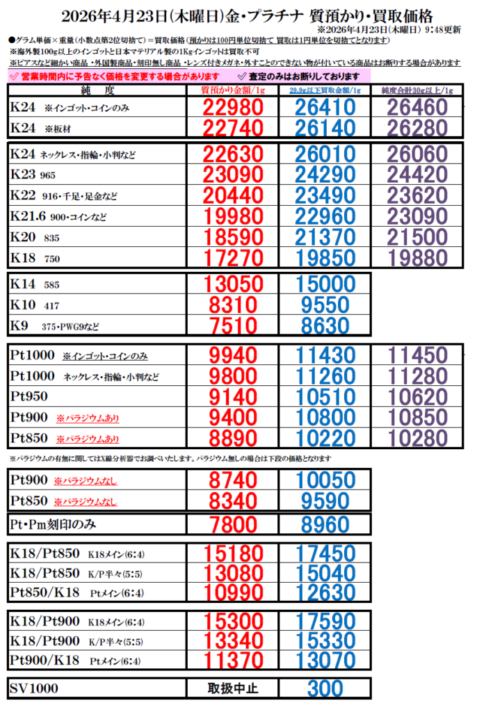 | K21.6(21.6金・900等) | 22960円/1g | 23090円/30g以上 |