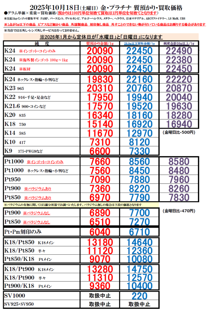 また当日においても国内価格の変動があった場合は当店買取価格も変更いたします。