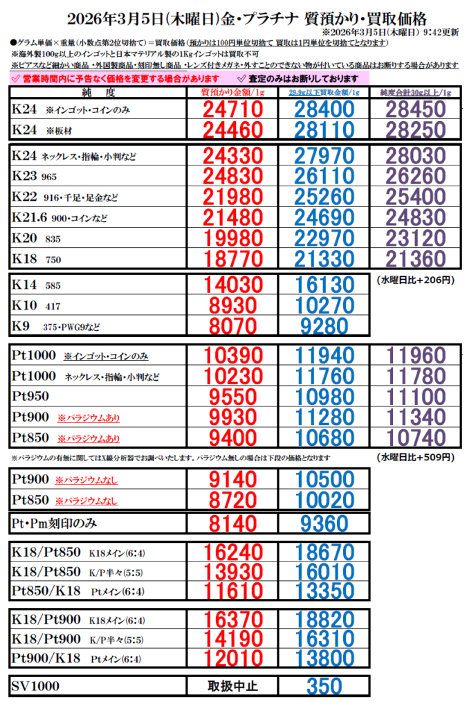 | Pt950 | 10980円/1g | 11100円/30g以上 |
