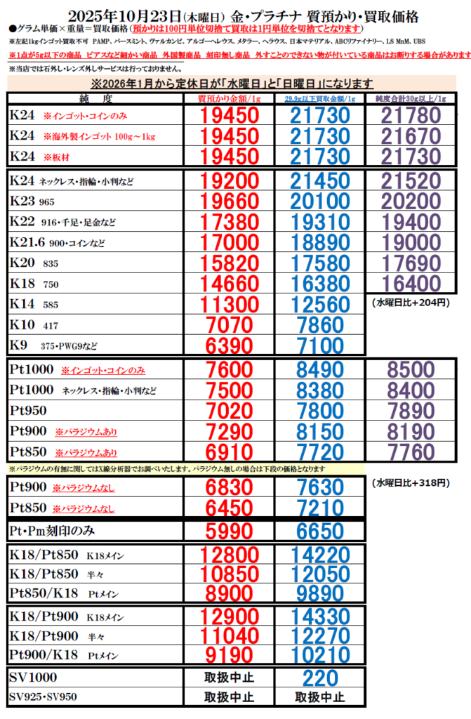 K20(20金・835) | 17580円/1g | 17690円/30g以上 |