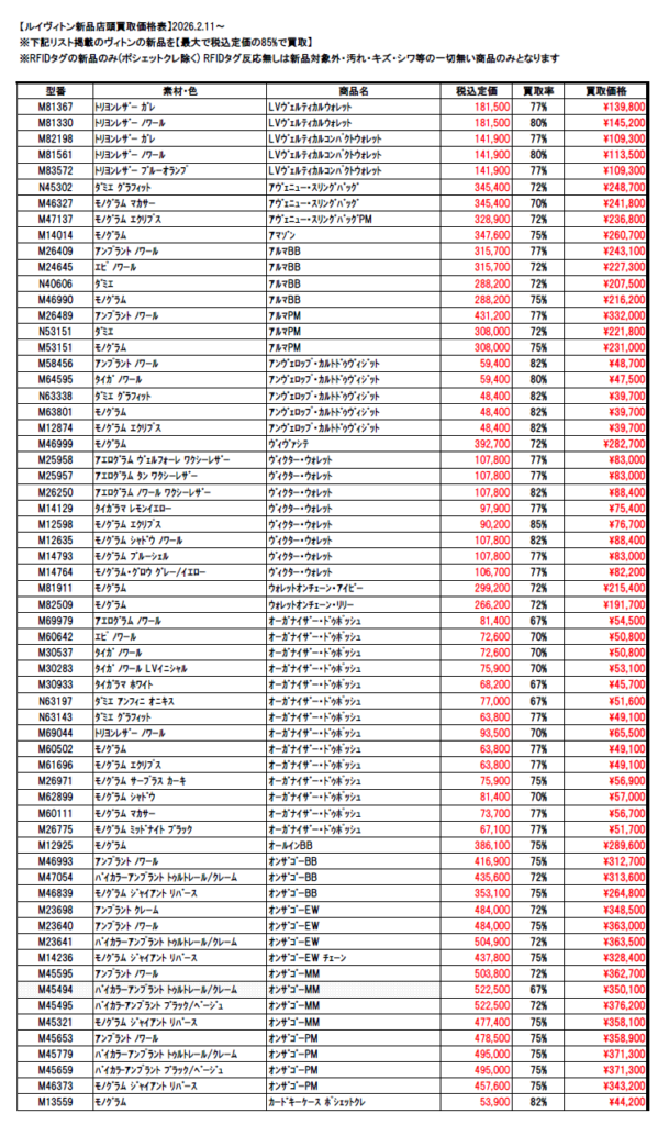 2026年2月ルイヴィトン新品買取価格表|ご案内|質屋・買取 群馬県太田市の質屋『質 林屋』