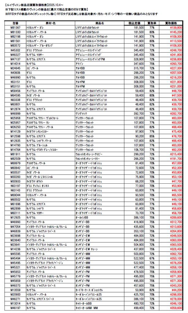 2025年10月ルイヴィトン新品買取価格表|お知らせ|質屋・買取 群馬県太田市の質屋『質 林屋』