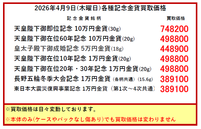 ※買取価格は毎日変動します。上記価格は当日のみ有効です。当日の買い取りは午前10時頃に更新します。